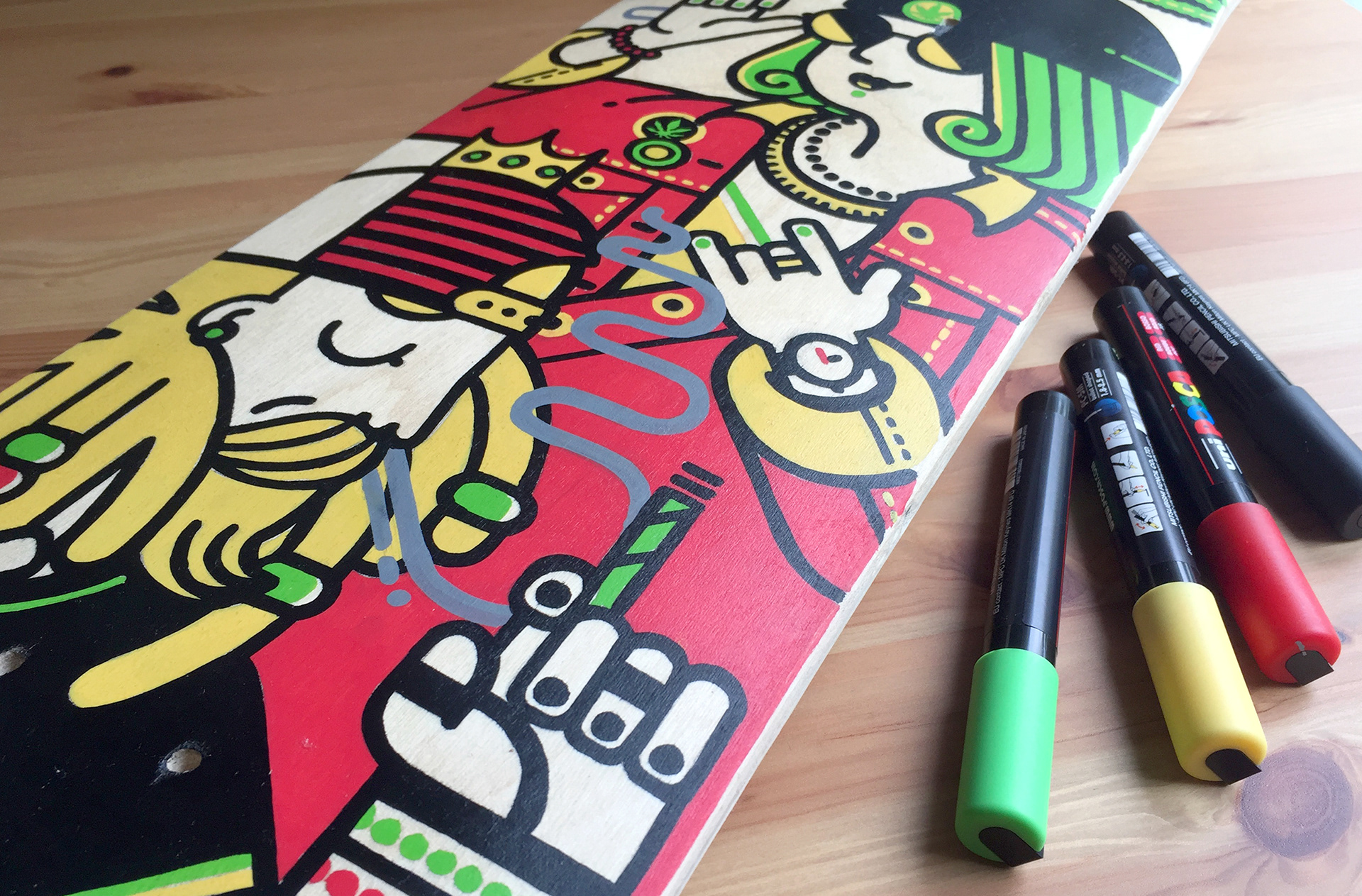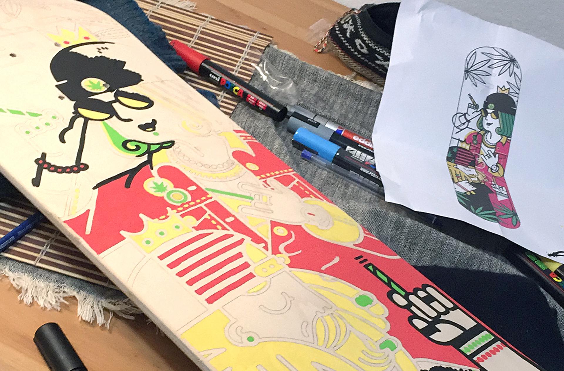 Handmade illustrations on skateboard decks